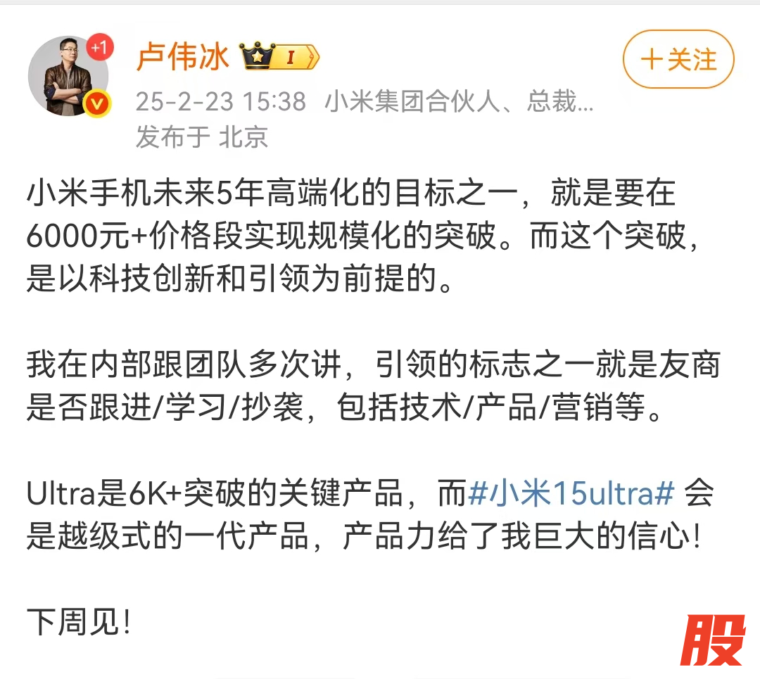2月23日下午,小米集团合伙人兼总裁、手机部总裁、小米品牌总经理卢伟冰发文称,小米手机未来5年高端化的目标之一,就是要在6000元+价格段实现规模化的突破。“Ultra是6K+突破的关键产品,而小米15Ultra会是越级式的一代产品”。同时,他在微博中还表示“下周见”,届时作为“代表小米最高水准”的新品手机小米15Ultra将正式发布。