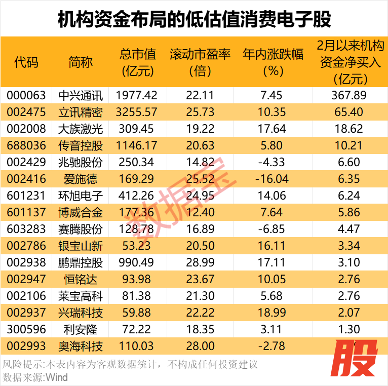 本月以来,机构资金对低估值消费电子股青睐有加,16股净买入超亿元,其中净买入中兴通讯达367.89亿元,立讯精密、大族激光、传音控股也均获超10亿元的净买入。