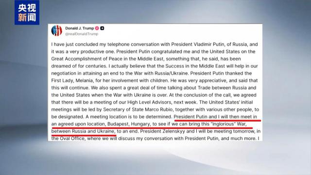17 日在白宫会见乌克兰总统泽连斯基时,特朗普呼吁俄乌双方"就地"停火,各自宣布"获胜"。据美媒披露,在白宫会谈中,特朗普施压泽连斯基,要求乌克兰在领土问题上妥协以快速实现停火,遭到拒绝后,两人不欢而散。