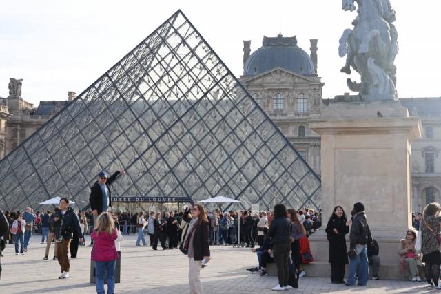 10 月 22 日,在法国巴黎,大量游客聚集在卢浮宫博物馆的玻璃金字塔入口前。新华社记者张百慧摄